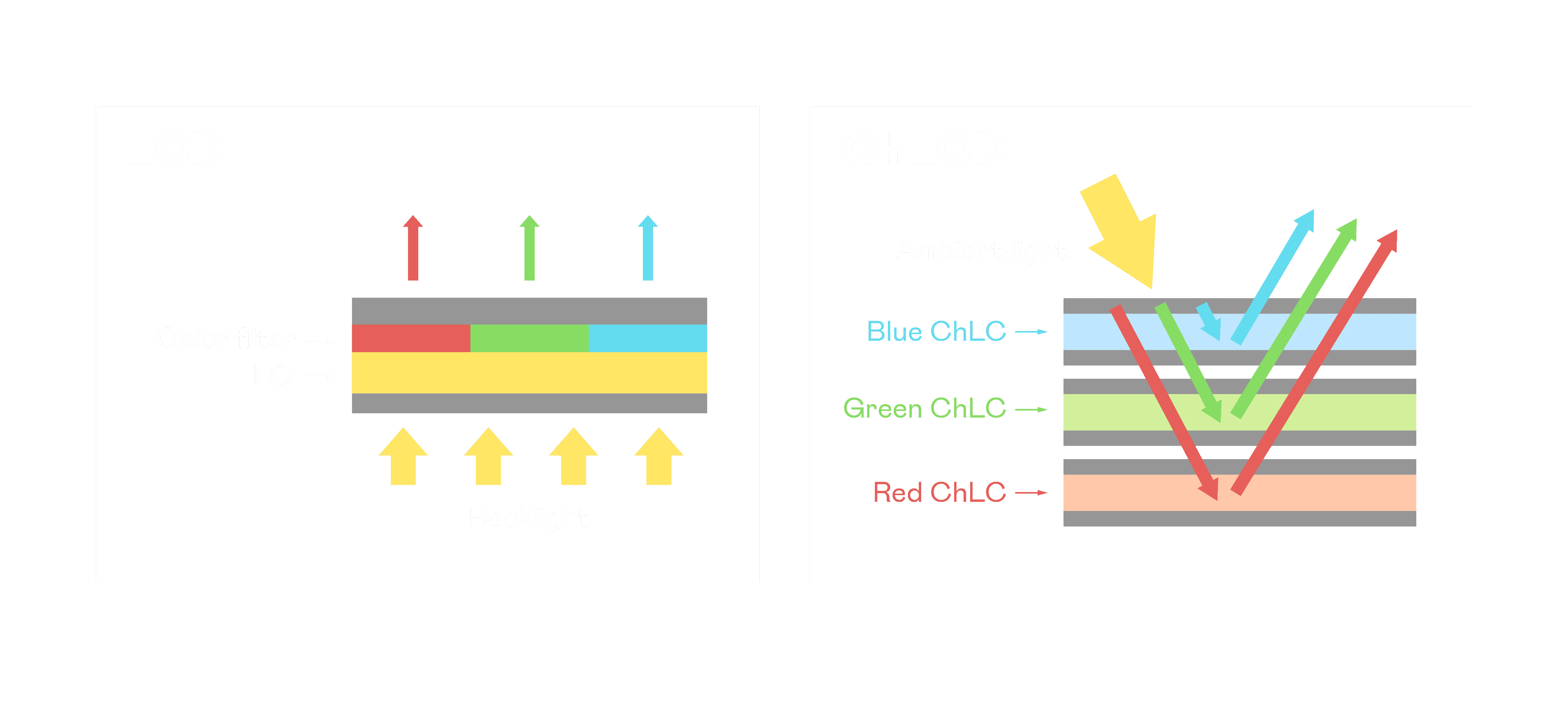 ChLCD 胆固醇液晶就如同纸张一样,,,,透过反射环境光来显示影像,,因此长时间观看不易造成人眼视觉疲劳,,,,可达到护眼效果。。。当处于户外阳光下使用,,,LCD 影像容易失真而不易观看,,但胆固醇液晶仍可维持较佳的影像品质。。